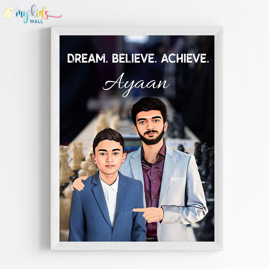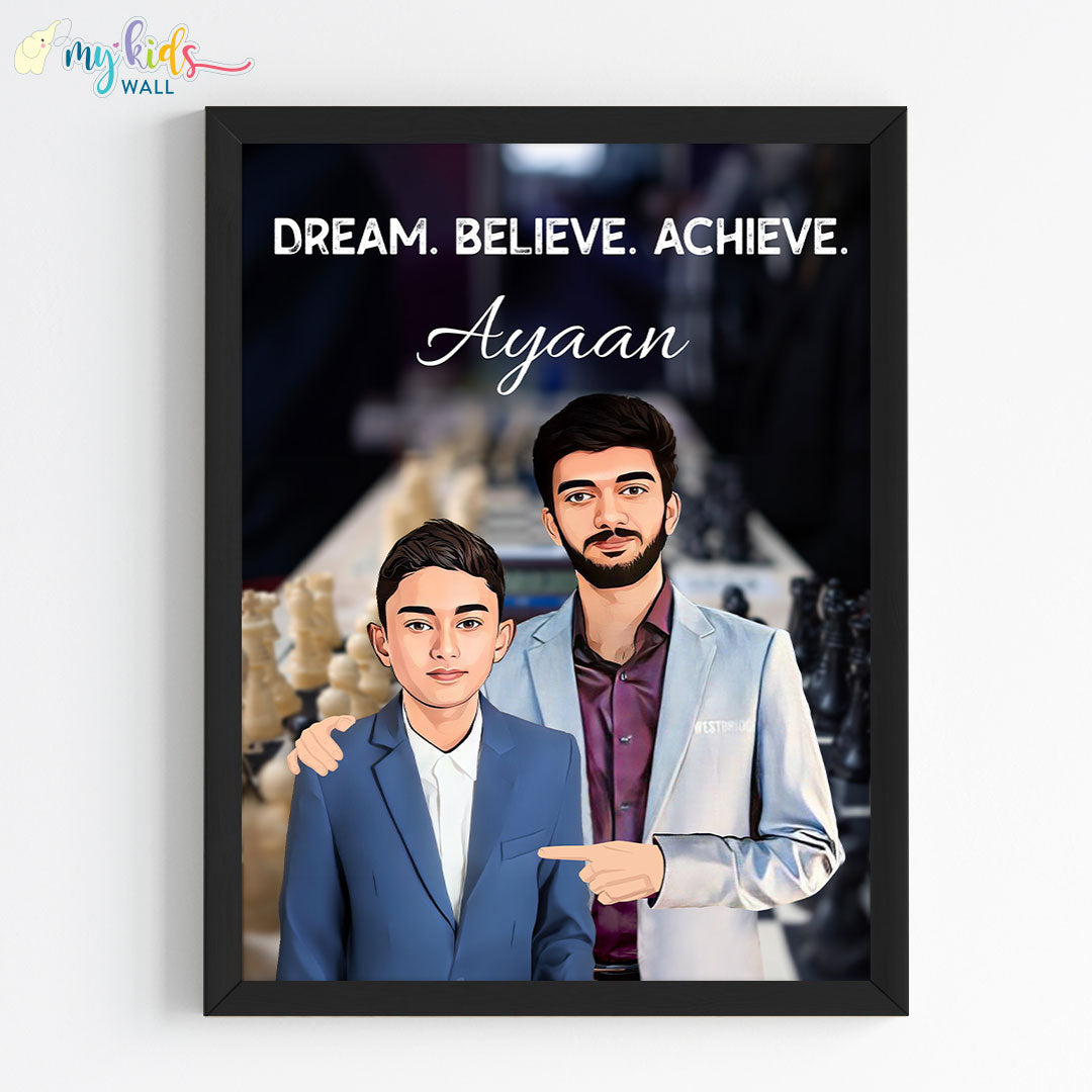 Our stunning Personalized Portrait features your young Chess Grandmaster with the World Chess Champion Gukesh Dommaraju making them best buddies while capturing the essence of determination and passion.