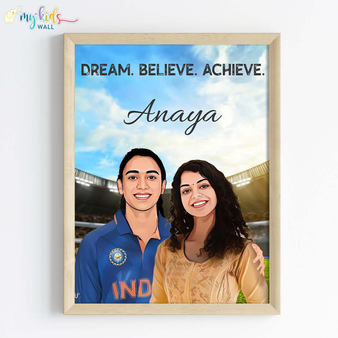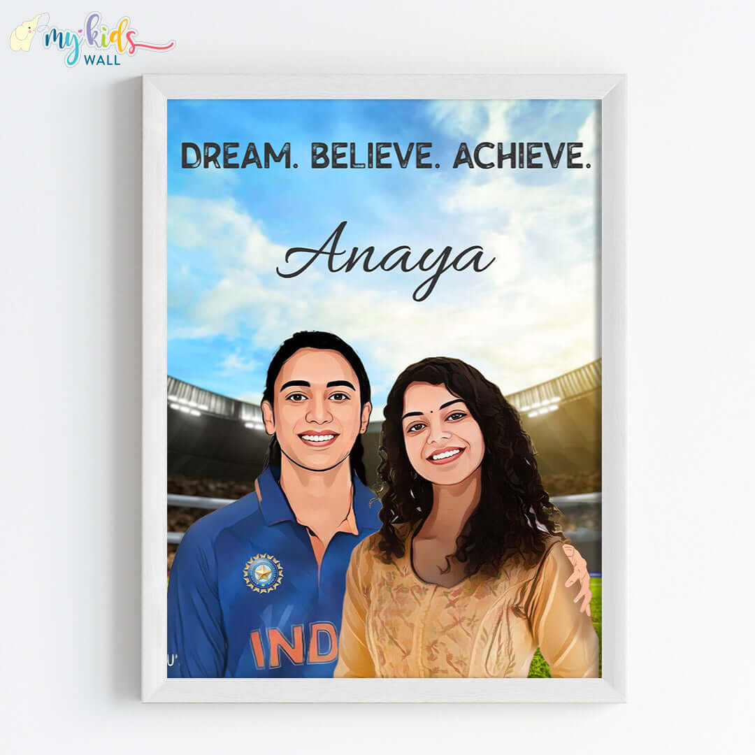 Our stunning Cricket Star Personalized Portrait features your young Cricket player with Team India's Smriti Mandhana making them best buddies while capturing the essence of determination and passion.