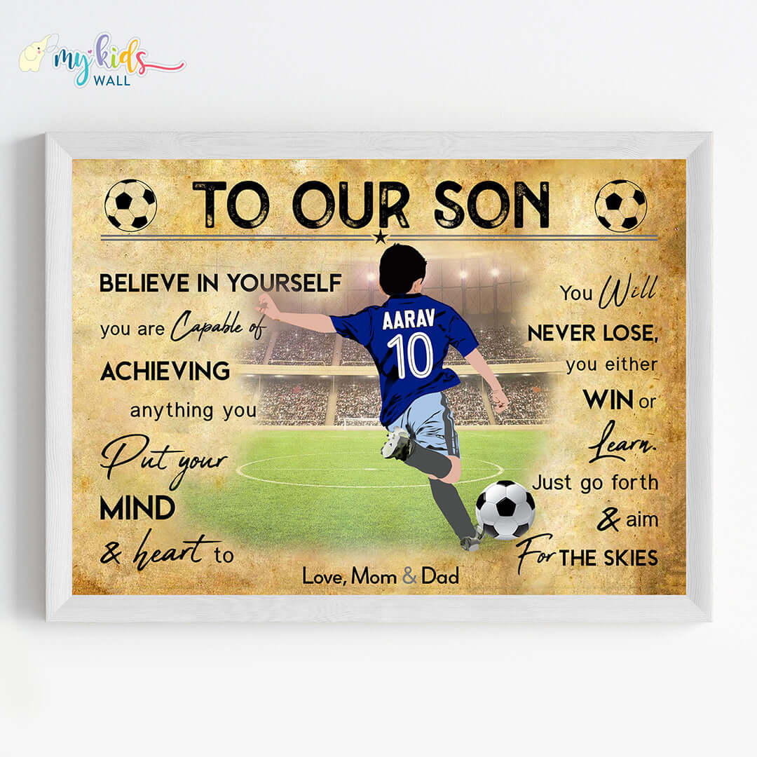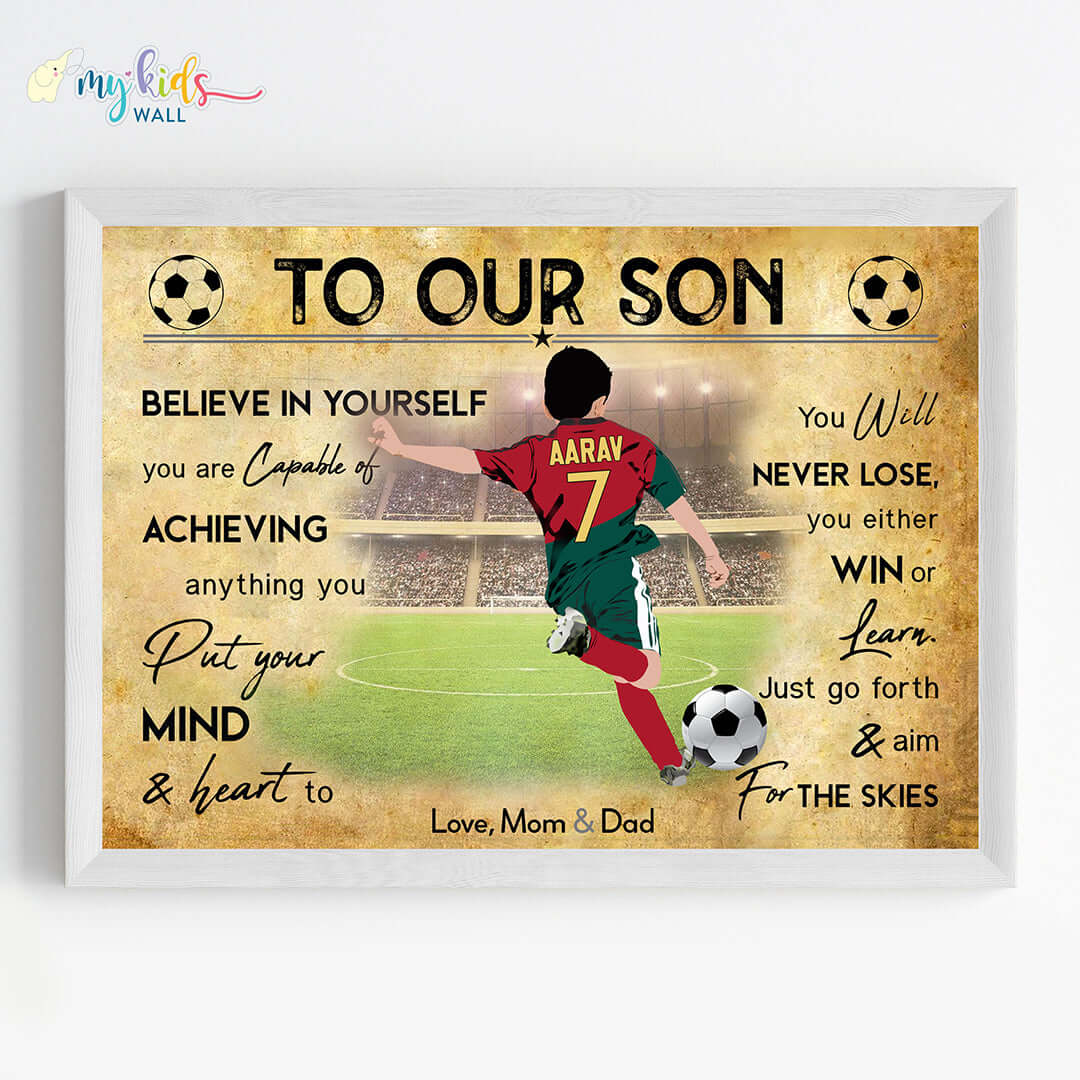 The image features a footballer kicking the ball, personalized with the name, jersey number, and motivational messages for success.