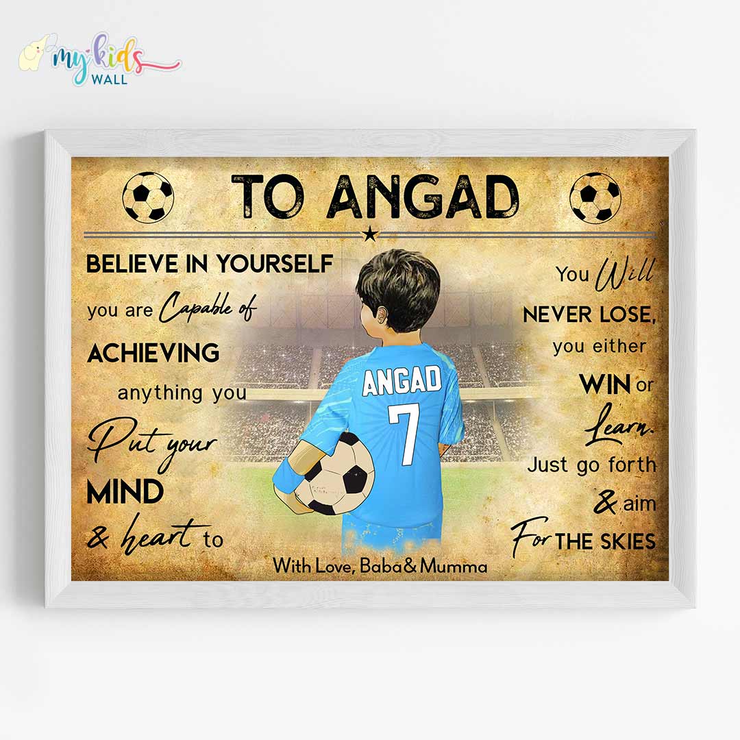 The image features a footballer boy with personalization of name, jersey number and motivational messages for success.