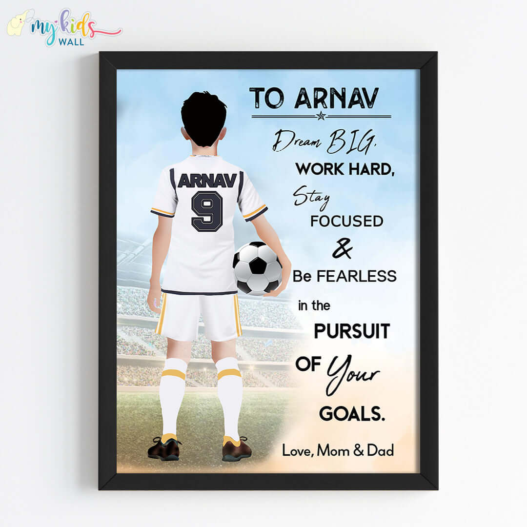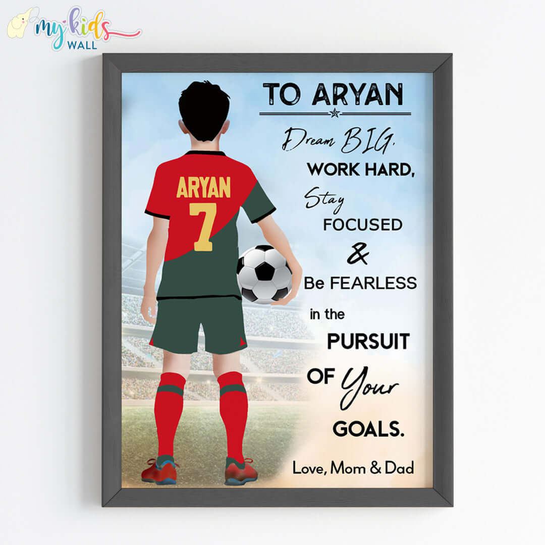 The image features a Footballer boy with personalization of name, jersey number and Motivational messages for success.